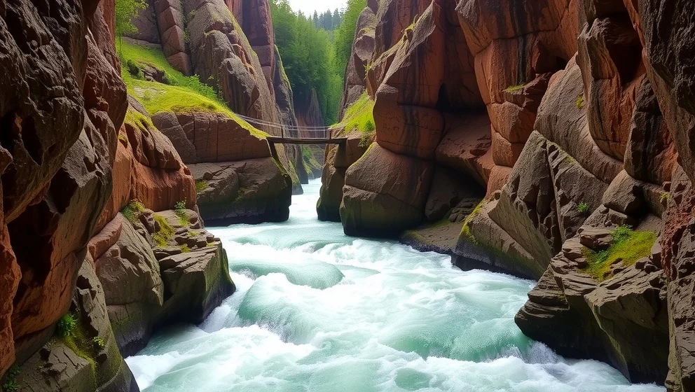 Den smala ravinen med sitt brusande vatten skapar en nästan mystisk atmosfär, särskilt när solljuset filtreras genom trädkronorna och reflekteras i vattenytan. Ljudet från det forsande vattnet ekar mellan klippväggarna och förstärker den dramatiska upplevelsen av platsen.